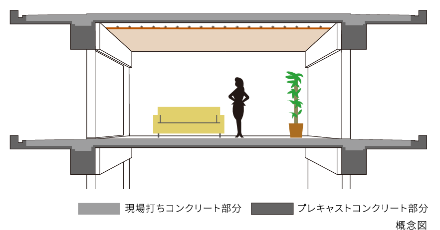 桁行大梁、内部スラブおよび外部スラブにPC工法(プレキャストコンクリート工法)を採用。あらかじめ工場で製造されたコンクリート部材を現場に運搬して接合するので、安定した品質と高い精度を有する構造体とすることができます。また、木製型枠の使用量削減、騒音・振動・粉塵の低減により、自然環境や周辺環境に配慮した工法です。※1階、205号室・214号室部分を除く。