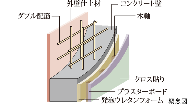 住戸壁は、鉄筋を二重に組み上げた「ダブル配筋」を採用。さらに外壁厚は180mm以上を確保しました。※共用廊下面、バルコニー面のALC部分を除く。