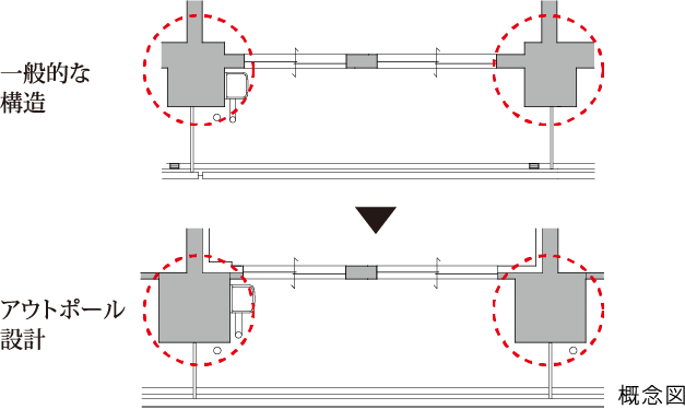 メインバルコニー側は、柱が室内に出ないアウトポール設計を採用しました。お部屋のすみずみまで利用できるので、広々とした空間が広がります。