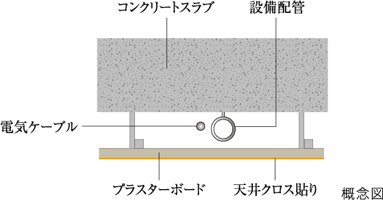 住戸棟の天井をスラブと天井との間に空間を設けた二重天井にすることで給排水管やガス管、換気扇のダクトなどの配管類を納めやすく、直天井工法に比べて将来の間取り変更やリフォームもしやすくなります。※共用棟・駐車場棟等付属施設および外構を除く。