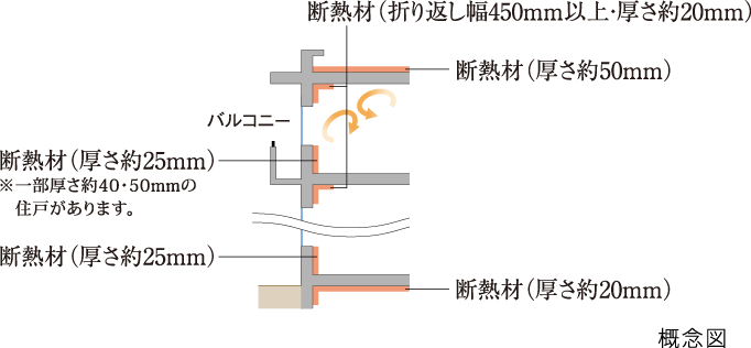 建物全体をくるむように、屋上や壁、床裏(住戸最下階)に断熱材を入れ、夏涼しく冬暖かい住み心地を実現。断熱性に優れた発泡硬質ウレタンフォームを、壁には約25mmの厚さで吹き付けることで、結露も軽減します。