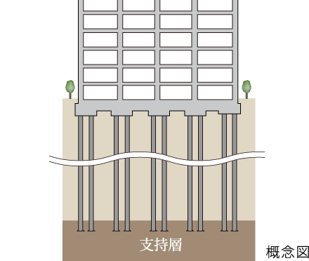 住戸棟の杭は、地盤調査結果により、杭径約600mm〜約1,000mm・杭長約16.5m〜約17.5m、計80本の杭を平均N値45以上の堅固な支持地盤まで構築し、建物荷重をしっかりと支えます。※N値・・・標準貫入試験で得られる地盤の強度・地層の硬軟・地盤の固さなどを示す数値のこと。※共用棟・駐車場棟等付属施設および外構を除く。