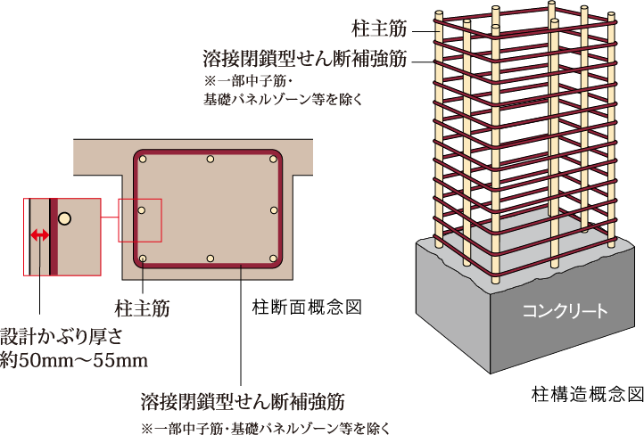 柱に耐久性を持たせると共に、せん断破壊を軽減するため約100mmのピッチでせん断補強筋(帯筋)を入れています。※共用棟・駐車場棟等付属施設および外構を除く。