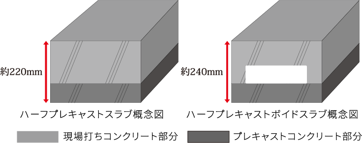 住戸スラブにはハーフプレキャストスラブ約220mmまたはハーフプレキャストボイドスラブ約240mm(Gタイプ、Iタイプ)を採用しており、床の強度や剛性を高めるだけでなく、遮音性にも優れた効果を発揮します。※205号室・214号室(在来約230mm)、1階、屋上を除く。