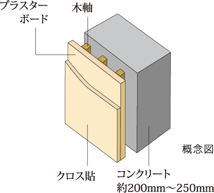 隣り合う住戸との生活音に配慮し、戸境のコンクリート壁は、厚さ約200mm〜約250mmを確保しました。