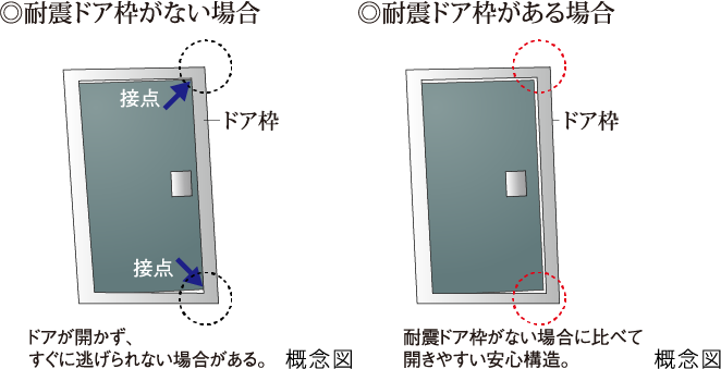 地震などの力により、玄関ドア枠が多少変形しても扉が開閉できる耐震枠付玄関ドアを採用しています。※多目的ルームからパーティルーム間・倉庫・管理室・清掃員控室・空調機置場等を除く。