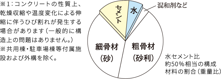 コンクリートの強度を左右する指標のひとつが、コンクリート調合(配合)におけるセメント量に対する水の量の重量比。数値が低いほど密実な、耐久性の高いコンクリートとなります。「ジェイグラン シティ 西明石 タワー ウエスト」では、コンクリートの水セメント比を50%以下としています。