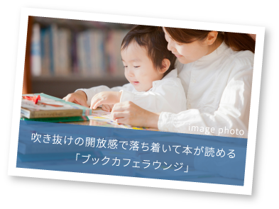 二層の吹抜けのブックカフェラウンジと大きな開口により、