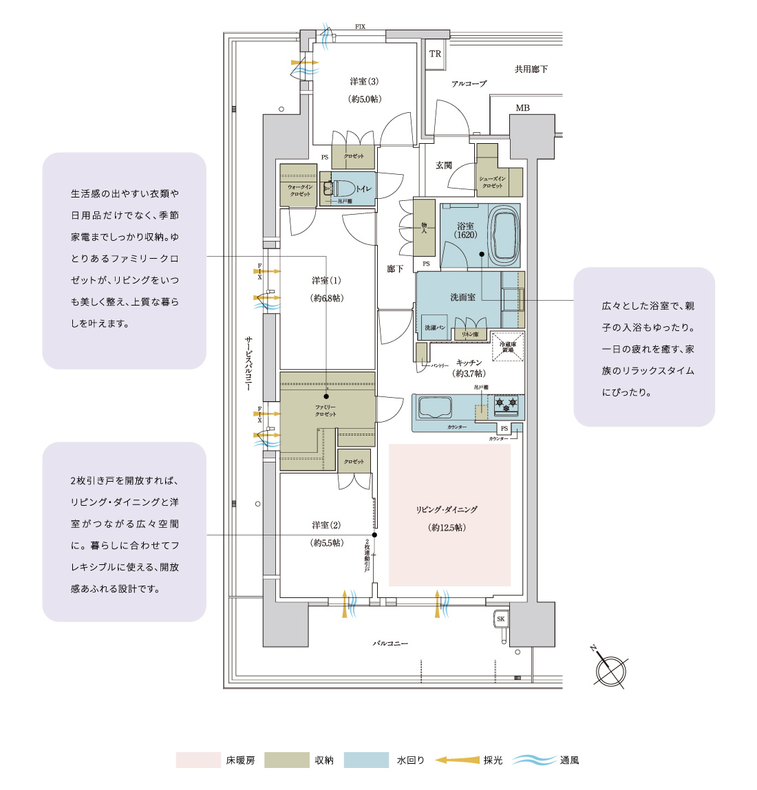 角住戸ならではの3面採光が叶い、明るく心地よい光に包まれる住まい。シューズインクロゼットやウォークインクロゼットで収納もたっぷり。引き戸を開け放てばリビング・ダイニングと洋室が一体となり、開放感あふれる広々空間に。家族の時間をゆったり過ごせる心地よい設計です。