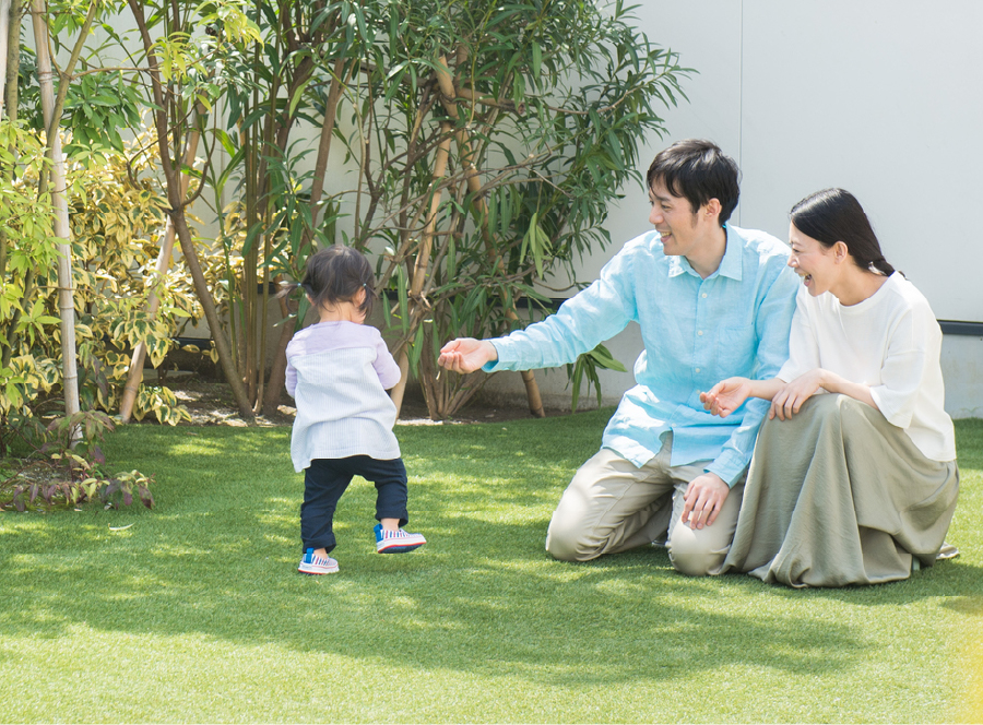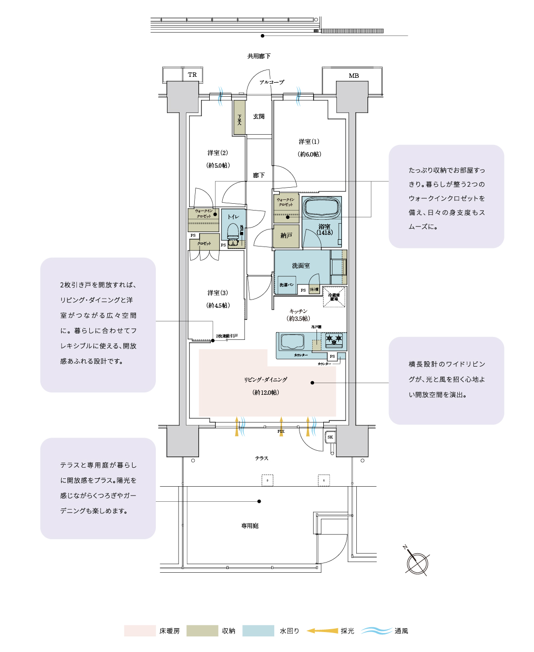横長リビングが光と風を招く心地よい住まい。2つのウォークインクロゼットと納戸で収納も充実し、すっきりとした暮らしをサポートします。リビングの先にはテラスと専用庭が広がり、開放感たっぷり。引き戸を開ければ洋室と一体の広々空間に変わる設計です。